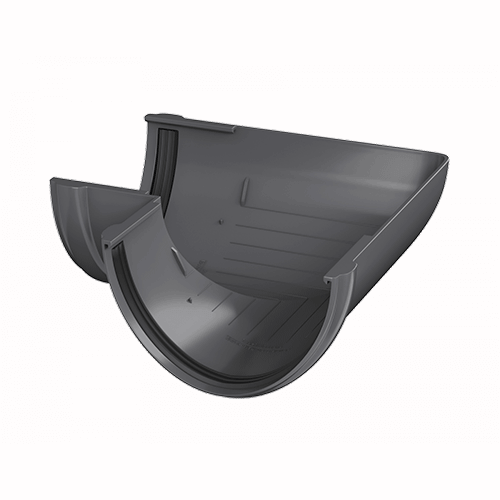 Угол желоба предназначен для соединения желобов на карнизах, которые лежат в одной плоскости, но расположены перпендикулярно относительно друг друга.